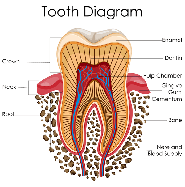 To discuss causes, we first must understand the basics of tooth structure. The crown of a tooth, the part above the gumline, is covered with enamel. Enamel is the hardest substance in your body. The root of a tooth isn’t covered with enamel, but with cementum. Cementum is “softer,” or less calcified than enamel. Below the outside protective layers of the enamel of the tooth crown and cementum of the tooth root, is dentin. Dentin is filled with tiny tubules, like tunnels, with microscopic nerve endings that extend to the inner portion of the tooth, the pulp. The pulp chamber contains larger nerves and blood vessels.
