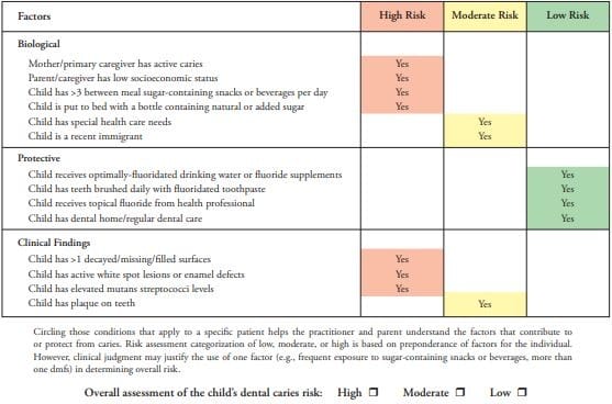 There are several risk factors for the development of early childhood caries including microbiological, environmental, and dietary. The most common contributing factors are improper feeding practices, familial socioeconomic background, parental lack of education in oral health, and lack of access to care2. Vertical transmission of bacteria from parent or caregiver or horizontal transmission from other family or children in school may encourage earlier development of ECC. Depending on the frequency and amount of exposure, children whose mothers have saliva containing Streptococcus mutans are at a much higher risk of developing caries early in life1. The AAPD’s Caries Risk-Assessment and Management for Infants, Children and Adolescents provides a chart to assess a child’s risk of developing early childhood caries.