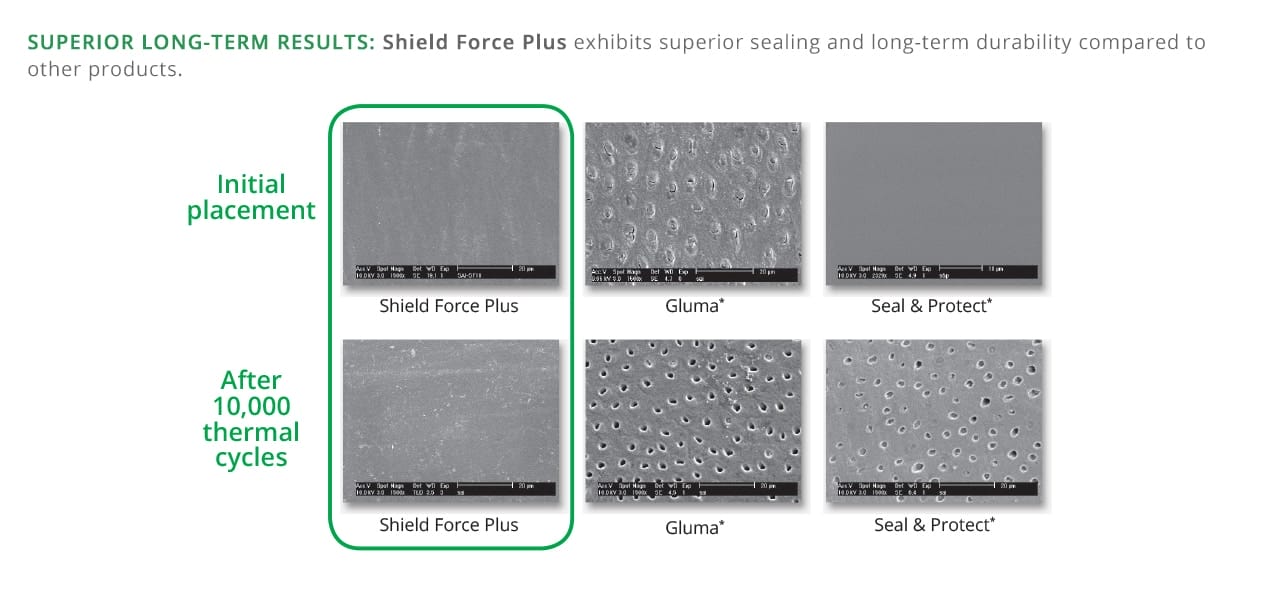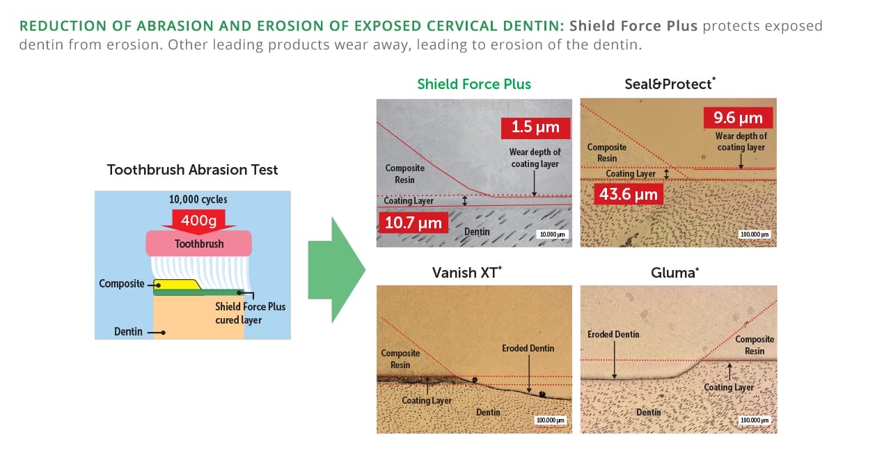 Further showcasing the effectiveness of Shield Force Plus’s ability to resist abrasion, a test was performed with 10,000 toothbrush strokes against different desensitizers to simulate a patient brushing their teeth three times a day for three years. Many resin-based competitors decreased almost 10 microns, whereas Shield Force Plus decreased only 1.5 microns. Also, other desensitizers such as Gluma and Vanish XT were worn away completely, exposing the underlying dentin to wear further and lead to further abrasion.