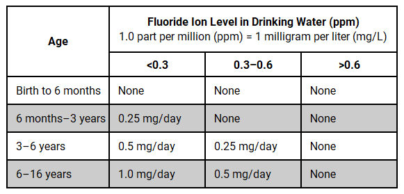 The recommended daily fluoride supplement dosages based on age and the fluoride concentration in the child’s primary drinking water are as follows:4,5