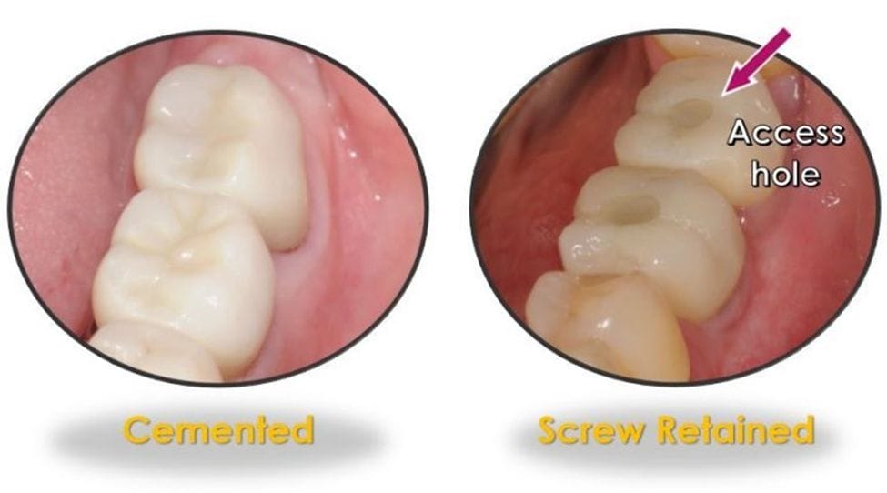Not only that, but dental hygienists should also be knowledgeable about the different restorative types, their retention, and possible complications. For example, is the crown screw-retained, or is it cemented? Screw-retained implant restorations will have an access hole on the occlusal surfaces of posterior teeth and the lingual surfaces of anterior teeth and should be evaluated for any missing filling material (Figure 1). Cemented implant crowns need to be closely assessed for the possibility of residual cement, a well-documented risk factor for peri-implantitis 2-3, 9,12 (Figure 2).