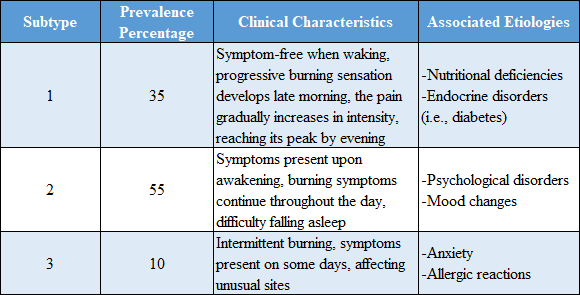Based on the level of pathology involved, primary burning mouth syndrome has also been broken down further into three subtypes or subgroups (see Figure 1). “The first subgroup is characterized by peripheral small diameter fiber neuropathy of oral mucosa. The second subgroup consists of pathology involving the lingual, mandibular or trigeminal system, and the third subgroup, labeled as having central pain, may involve the hypofunction of dopaminergic neurons in the basal ganglia.”2 Some individuals will overlap in these subtypes.2