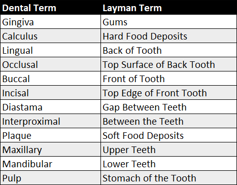 I have composed a list of some dental terms and their conversions as an example of how clinicians can better communicate with their patients so that understanding and clarity is accomplished.