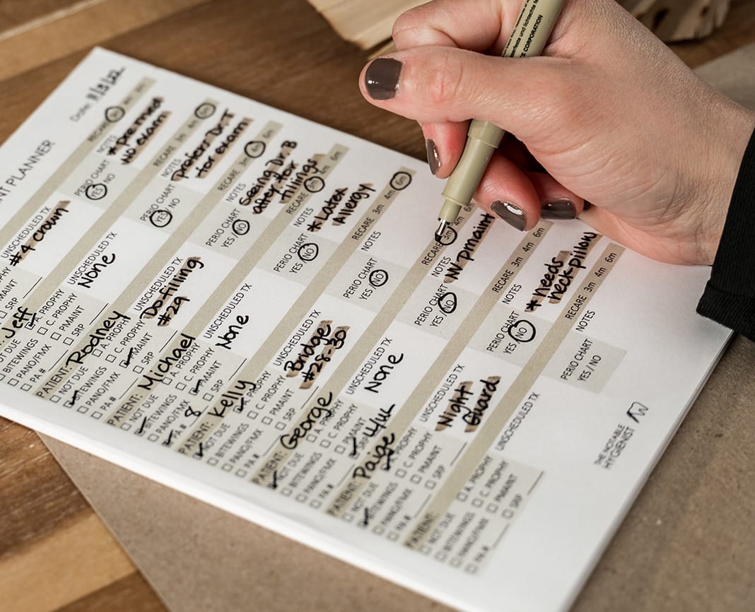 Additionally, printing out multiple routers was not the system I wanted to use. I knew there had to be a better way to log this information. I wanted a note-taking tool to let me see all my patients for the day and create a way to organize these details onto a single sheet of paper. Since being organized is essential for hygienists, having an aesthetic and straightforward layout was necessary to include this information about each patient.