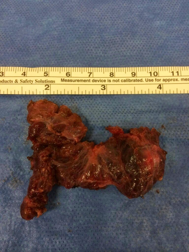 An appointment was then made with an ear, nose, and throat surgeon. The options were discussed, and a total thyroidectomy was decided to be the best treatment with possible radiation treatment. The surgery took three to four hours and was successful. The surgeon explained that instead of her thyroid gland looking like a butterfly, it was so encapsulated with her throat that to make sure all thyroid tissue was removed (see Figure 1).