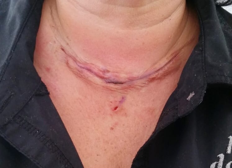 When she was released, she was instructed to limit turning her head from side to side. Unfortunately, she developed an extremely stiff neck and had a lot of muscle spasms (see Figure 2). She slept propped up for a week. Follow-up with the endocrinologist was next with radiation treatments.