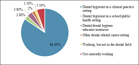 In total, 1,280 eligible participants completed the survey. Of those, almost 99% held an active dental hygiene license. Over 84% of respondents said they primarily work in a clinical practice setting. Of the 1,280 participants, 71 (5.5%) claimed not to be working at the time of the survey.