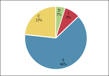 Participants who were assessed as exhibiting a single, dominant personality style totaled 1,032. The remaining 248 were found to have an equal combination of multiple styles. Of the four personality profiles, D (dominant) personality types were the smallest group at 5%. I (influencing) personalities came in at 8%, and C (conscientious) respondents came in at 23% of respondents. The overwhelming majority, 64% (659 respondents), scored as S (steadiness) personalities.*