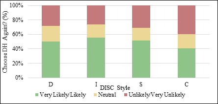 However, the margins begin to narrow for this question. Those with I personality types were most likely (55%) to choose dental hygiene again. In contrast, C personality types were least likely (41%) to choose dental hygiene again. D and S personality types yielded similar results, each around 50%.