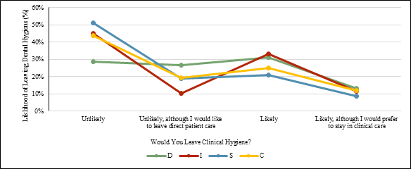 Finally, participants were asked, “How likely are you to leave clinical hygiene for reasons other than retirement?” Considering only responses from those currently in private practice, S personalities were found to be most likely to remain in the dental hygiene field, while I personalities were most likely to leave.