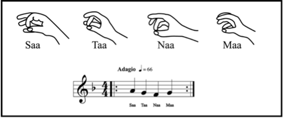 The chant or mantra Sa Ta Na Ma is to the melody of the first four notes in the first line of Mary had a Little Lamb. The mudra or finger movements are as follows: