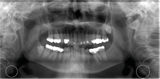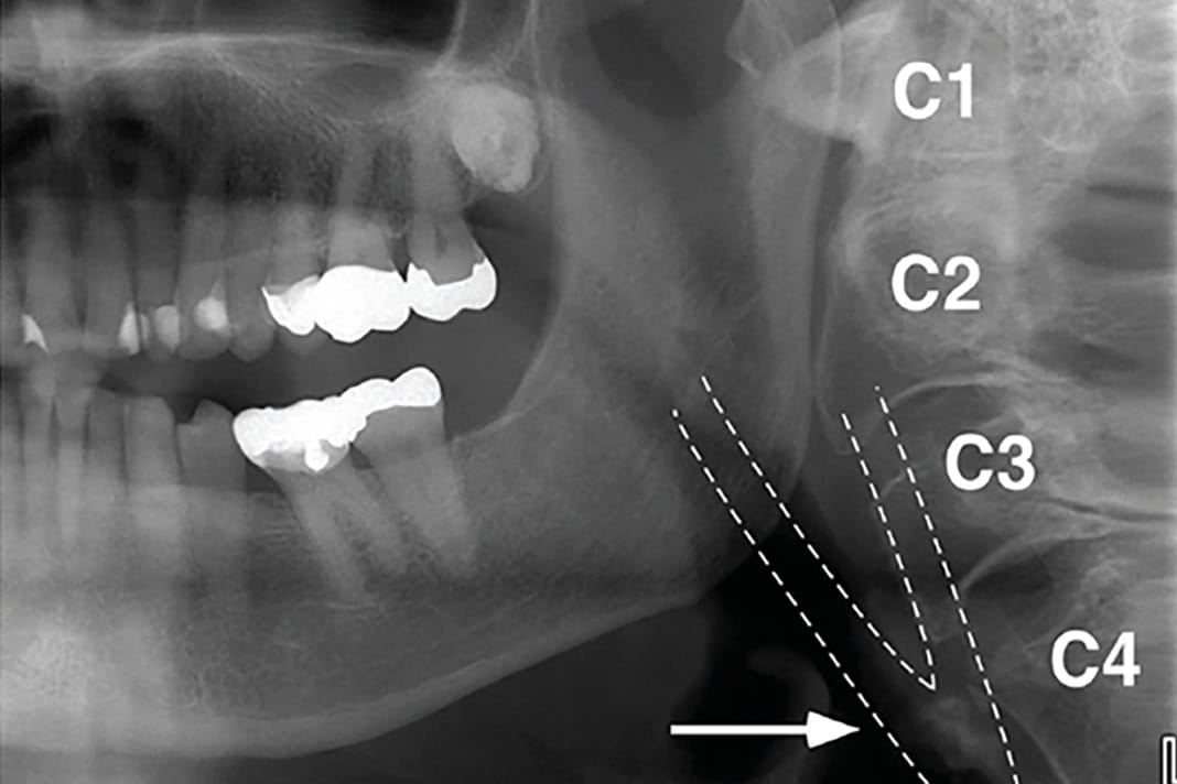 On a PAN, carotid artery calcification (CAC) can appear as a radiopaque lesion that is either rounded or nodular in shape (see Images 1 and 2).9,10 CACs most often present themselves between the C3 and C4 vertebrae. They can be localized to one side or appear bilaterally.10 Moshfeghi et al. stated, “Panoramic radiographs may help us to detect CACs in patients with or without other associated risk factors.”10 This means dental hygienists may be the first ones to discover these in their patients.