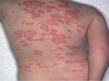 - Red lattice-like rash with odd margins called erythema marginatum on the trunk, upper arms, and legs, and (rarely) on the face, soles, and palms (see Figure 4)