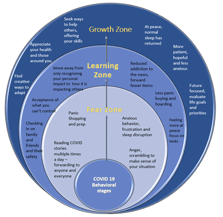 The image is an adaptation of fear to growth models of behavior that has been modified to show behavior related to COVID-19 stressors. You may have seen several variations through social media during this crisis. Identify where you are currently and what the behaviors of the next stage look like. Be kind to yourself as you determine where you currently fit. People who have suffered a larger impact may move more slowly through these stages, and that is OK.