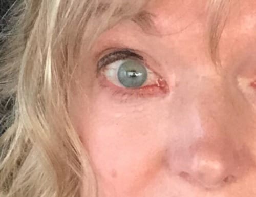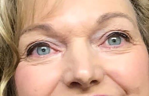Photo 1: Before surgery: Right eye is slightly red and glassy with a small, red line on lower lid. Photo courtesy patient.