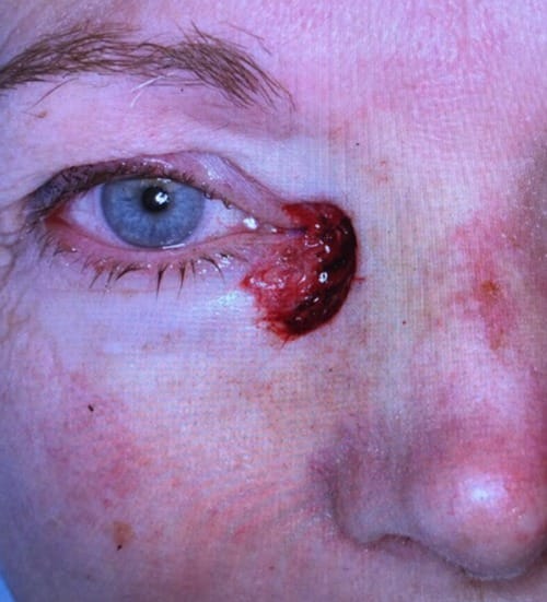 She was referred to Mayo Clinic for treatment that included full excision of the cancerous lesion, as seen in photo #2. The size and depth of cancer came as a complete shock to her, as she had expected it to be tiny and superficial.