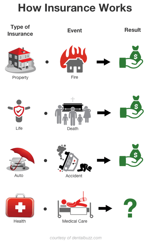 This might be a good time then to start talking about dental insurance. Before we do that, though, let’s explore more generally. What is insurance? It’s money you pay to someone else to take care of things if the unexpected happens.